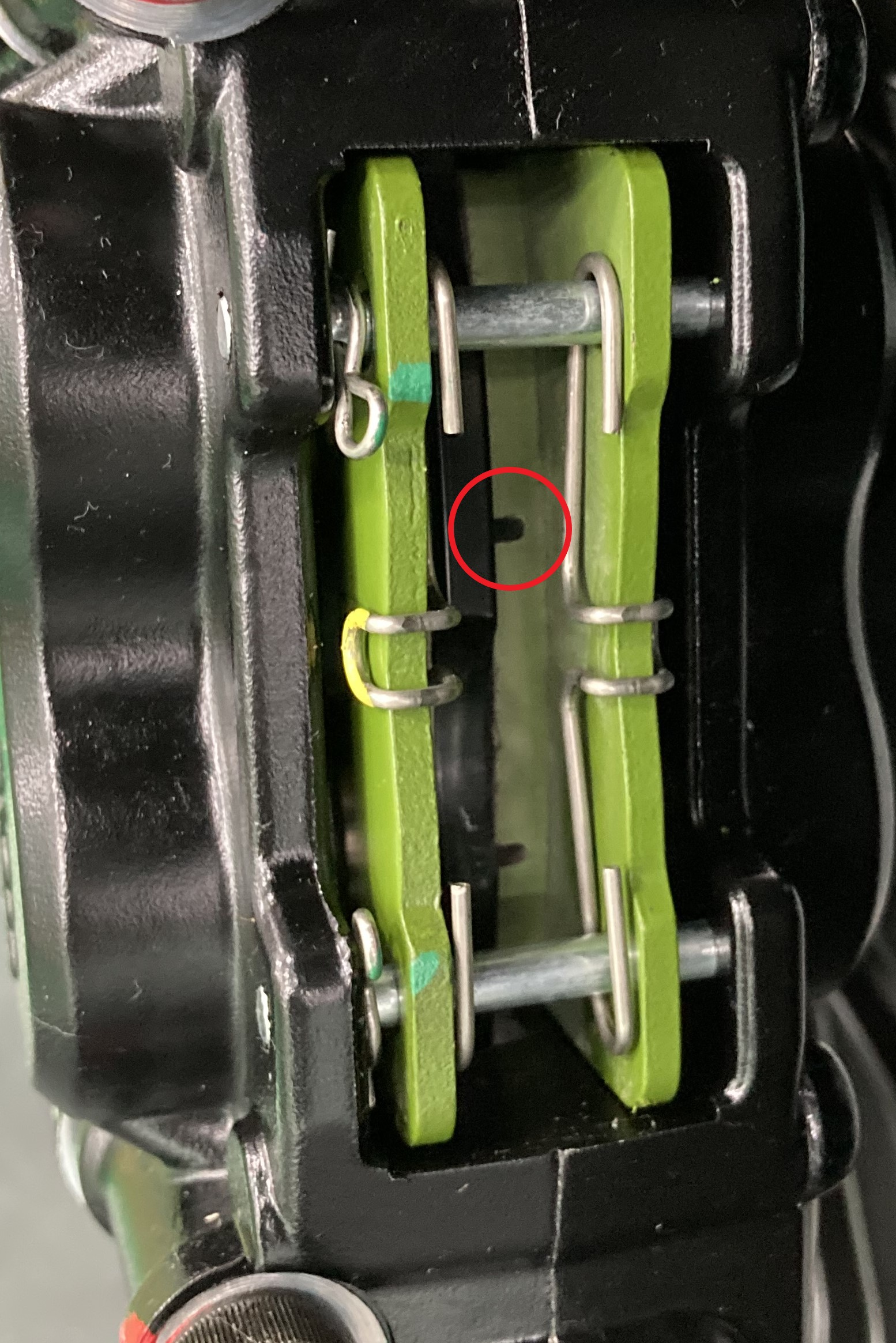 Brake pad thickness groove indicates brake pad wear level